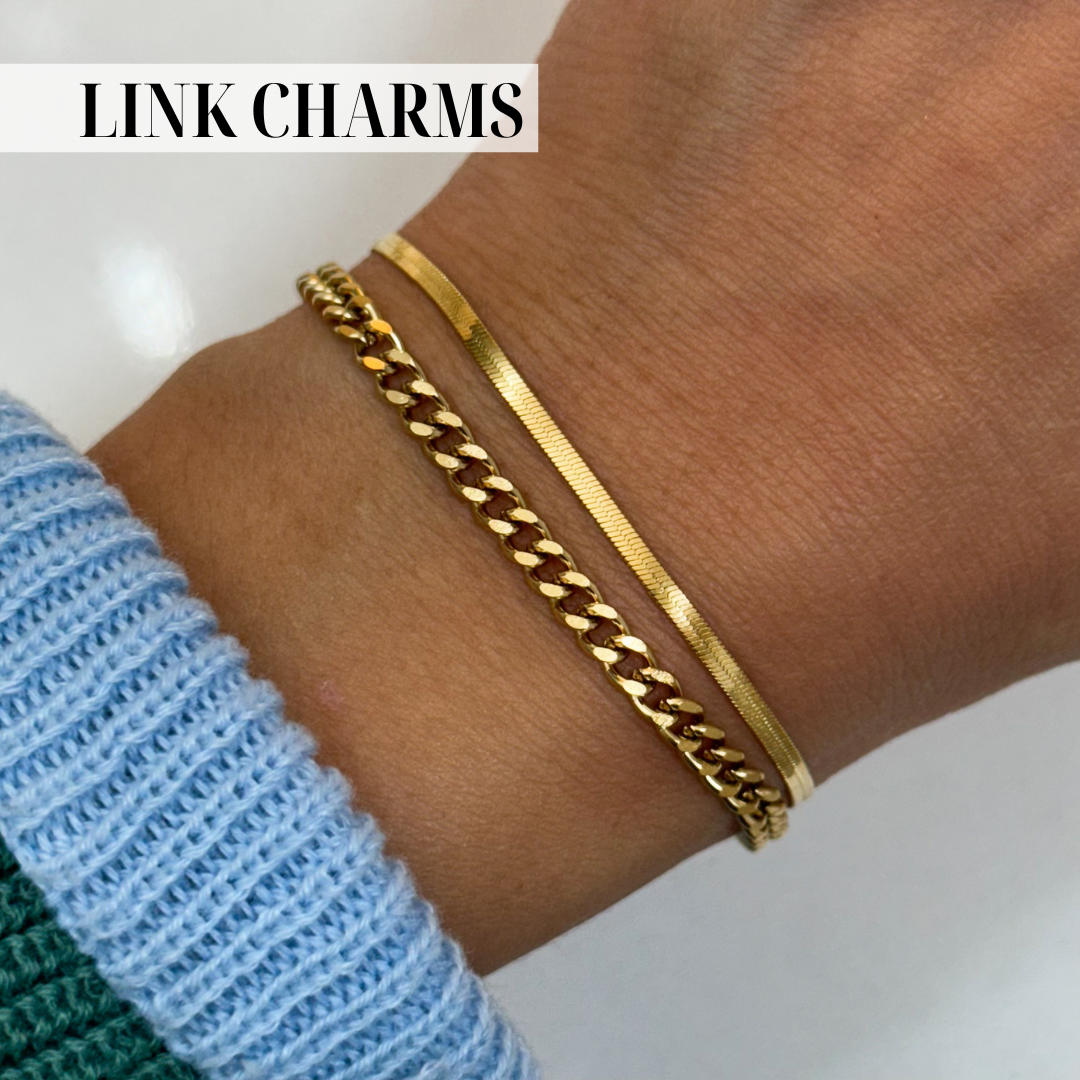 This chain can have charms LINKED to the actual chain loops (charms won't move around). Please leave me a note for the order you want the charms in.